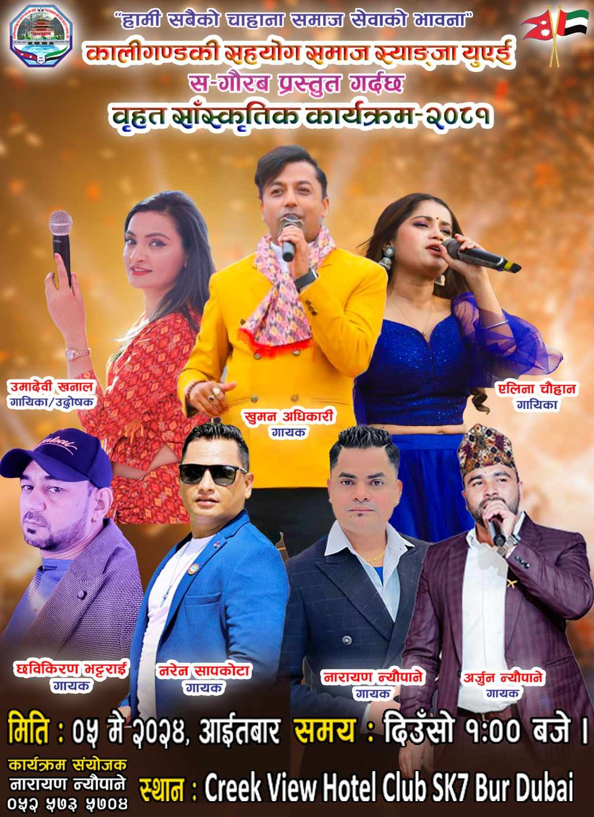 क्रीक भ्यू होटल बरदुबई युएईमा मे ५ तारिक हुने सांगीतिक कार्यक्रमको लागि नेपालका ख्याती प्राप्त राष्ट्रिय कलाकारहरू खुमन अधिकारी , एलिना चौहान , उमादेबि खनाल ,छबि किरण भटराई युएईमा स्थापित कलाकारहरु नारायण न्यौपाने ,नरेन सापकोटा ,अर्जुन न्यौपाने लगायतको बेजोड प्रस्तुतीमा “साँस्कृतिक कार्यक्रम” आयोजना गरिएको कार्यक्रमको तयारि अन्तिम चरणमा पुगेको समाजका अध्यक्ष नारायण प्रसाद न्यौपानेले जानकारी गराएका छन |