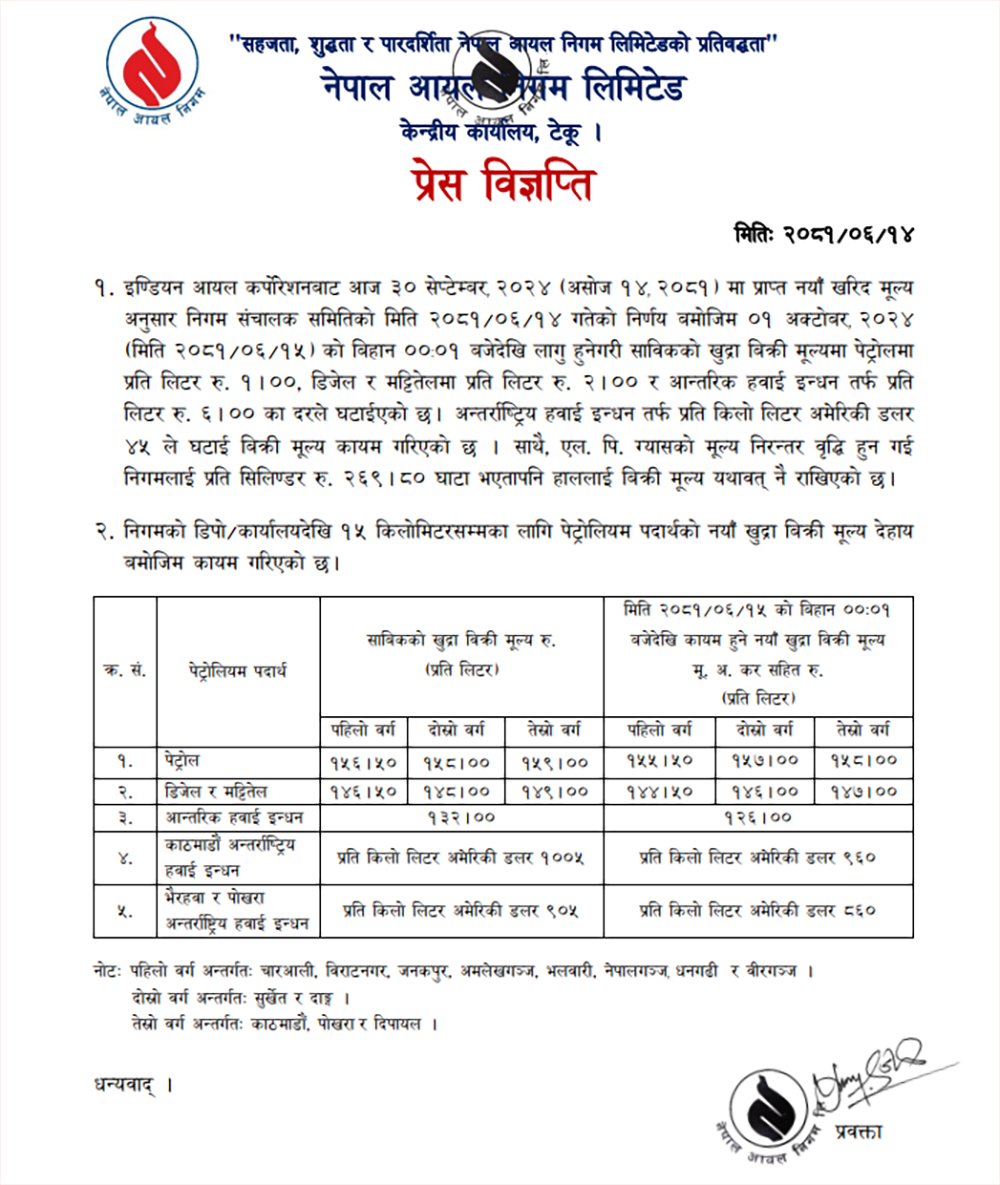 सोमबार राति १२ बजेबाट लागु हुने गरी निगमले पेट्रोलमा एक, डिजेल र मट्टीतेलमा २-२, हवाई इन्धनमा आन्तरिकमा ६ तथा बाह्यमा प्रतिहजार लिटरमा ४५, मट्टीतेलमा दुई रुपैयाँ मूल्य घटाइएको निगमले जनाएको छ ।