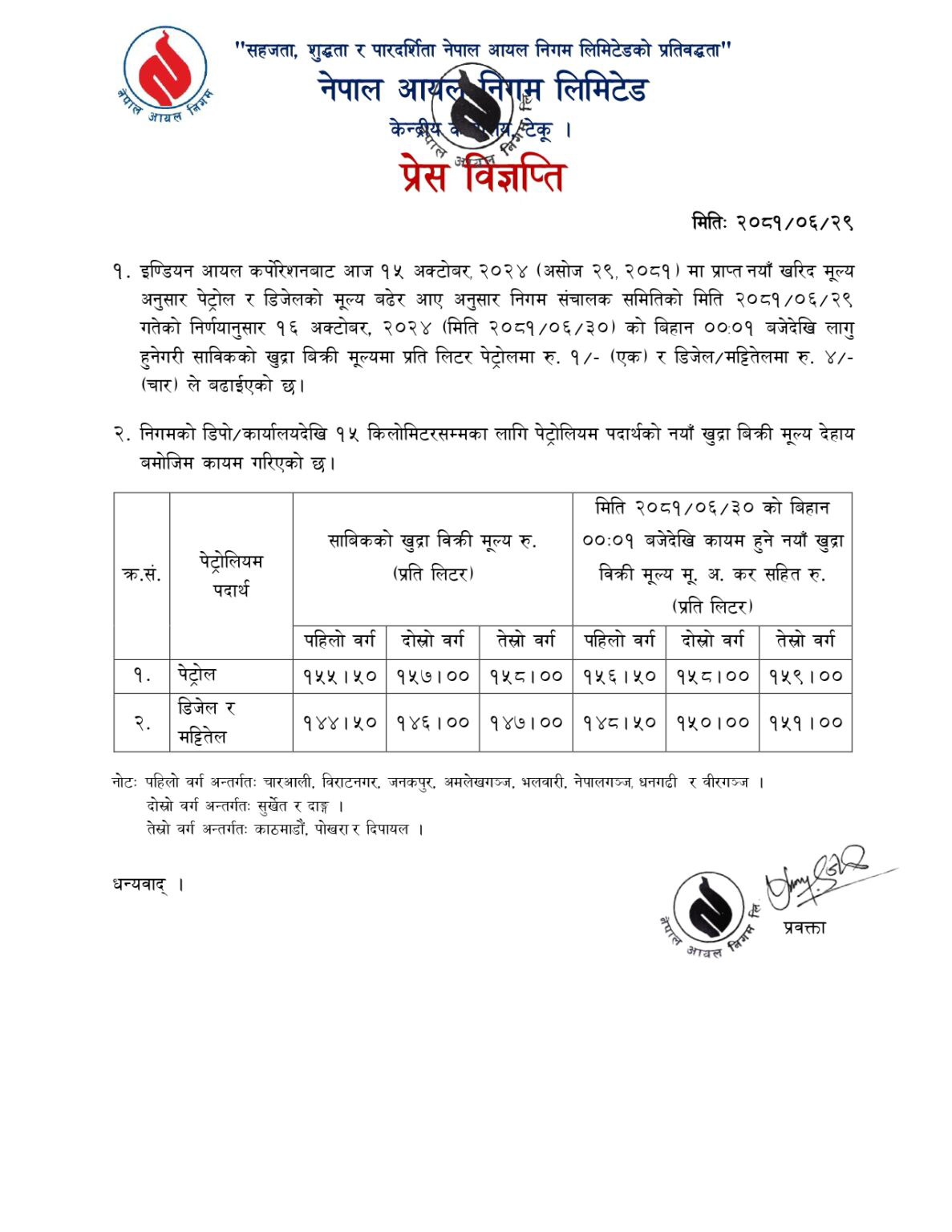 काठमाडौँ, २९ असोज : नेपाल आयल निगमले पेट्रोलियम पदार्थको मूल्य वृद्धि गरेको छ । निगम सञ्चालक समितिको बैठकले आज रातिदेखि लागू हुने गरी पेट्रोलमा प्रतिलिटर रु एक , डिजेल र मट्टितेलमा प्रतिलिटर रु चार वृद्धि गरेको हो ।